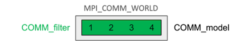 Figure 1: Example of a typical configuration of the communicators for the offline coupled assimilation with parallelization. We have 4 processes in this example. The communicators COMM_model, COMM_filter are initialized. COMM_model and COMM_filter use all processes (as MPI_COMM_WORLD). Thus, the configuration of the communicators is simpler than in case of the parallelization for the online coupling.