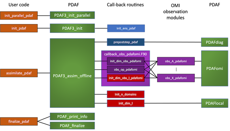 - column 5 'PDAF': Some of the call-back routines and the routines in the observation modules call PDAF core routines, e.g. for diagnostics, localization, and to intialize OMI.